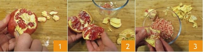 To prepare the cod with pomegranate sauce, start by scoring the skin of the pomegranate with a small knife 1 to mark the sections and open the fruit more easily 2; then deseed the pomegranate and collect the seeds in a bowl 3.