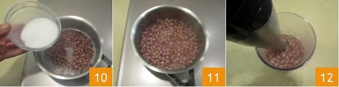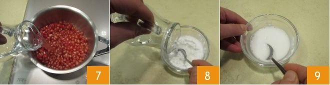 Add the dissolved potato starch into the saucepan with the pomegranate seeds 10, stir and cook for another 2 minutes. Turn off the heat 11 and transfer the mixture into a blender jug 12, blend until you get a smooth sauce.
