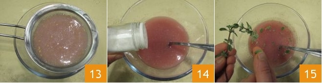 Strain the sauce obtained through a sieve 13, to retain the harder part of the seeds. Season the pomegranate sauce with salt 14 and pepper and flavor it with marjoram leaves 15.