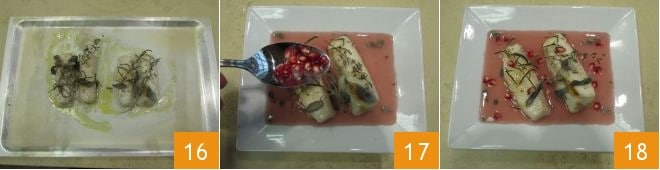 Meanwhile, the cod will have finished cooking, take it out of the oven 16 and prepare the serving dish: pour the pomegranate sauce on the bottom, place the cod fillets on top, garnish with the reserved pomegranate seeds 17 and serve your cod with pomegranate sauce immediately 18.