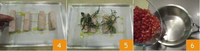 Take care of the fish: line a baking tray with baking paper, drizzle with a little olive oil, and place the cod pieces on top 4, season with salt, pepper, and the herbs required by the recipe: rosemary, thyme, and sage 5. Bake the cod in a preheated static oven at 428°F for 30 minutes. While the fillets are cooking, prepare the sauce: pour the pomegranate seeds into a saucepan (save some fresh ones for the final decoration).