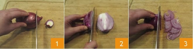 To prepare the cod with sun-dried tomato paste, start by cleaning the Tropea onion: remove the ends 1 and the outer layer of the onion, then cut it in half 2 and finally into very thin slices 3.