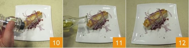 Once cooked, transfer the cod to plates, placing it on a base of chopped sun-dried tomatoes, then add a few slices of raw onion, a sprinkle of black pepper 10, and a drizzle of raw oil 11: your cod with sun-dried tomato paste is ready to be served 12!