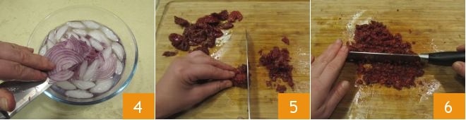 Transfer the onion slices to a bowl with ice water, this way it will retain its crunchiness 4. Take the sun-dried tomatoes in oil, drain them, and cut them into pieces 5, then finely chop them with a knife until you get a paste 6.