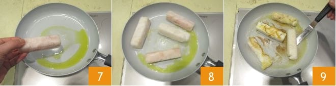 Now pour the oil into a non-stick pan and heat it over medium-high heat, then slightly lower the heat and add the cod 7: cook for about 6 minutes without turning it, rotating the pan to distribute the oil evenly and prevent the pieces from sticking to the bottom 8. After this time, gently turn the cod with a spatula and let it cook for another 6 minutes over medium heat 9. In the meantime, drain the red onion and dry it with kitchen paper.
