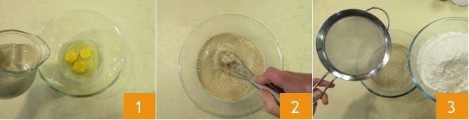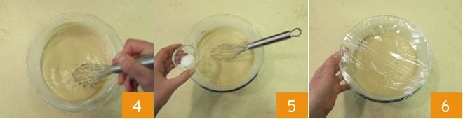 and mix with a whisk 4. Add a pinch of salt 5 and mix vigorously again to obtain a smooth and homogeneous batter. Cover with plastic wrap 6 and let rest in the refrigerator for 30 minutes.