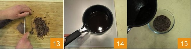 Now move on to the sauce: chop the other portion of dark chocolate 13 and heat the remaining coffee until it almost boils 14. Pour the coffee over the chocolate 15