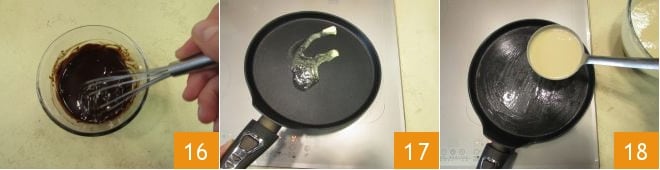 and stir until it melts 16. Set aside and don't worry if the cream tends to solidify; simply reheat it before pouring it over the crepes. Now it's time to cook your crepes: heat a crepe pan or a non-stick skillet, grease it with a pat of butter 17, and pour a ladle of batter 18.