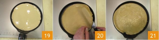 Rotate the pan to distribute the batter evenly and cook for about a minute 19. When the typical bubbles form on the surface and the edges come away, flip them 20 and cook on the other side for about half a minute 21. Continue in this way until all the crepes are cooked.