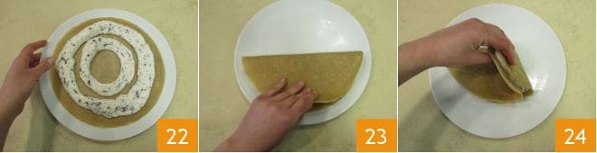 Move on to the filling: take the ricotta cream and squeeze a portion inside the crepe, making two loops 22, then fold it first in half 23 and then again in half 24