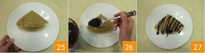 to form a triangle 25. Fill all the others in the same way, heat the chocolate sauce, and use it to decorate your coffee crepes before serving them (26-27).