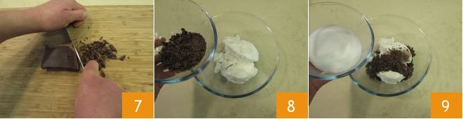 In the meantime, prepare the filling: coarsely chop 50 g (about 1.75 oz) of dark chocolate 7 and add it to the ricotta 8. Then add the granulated sugar 9,