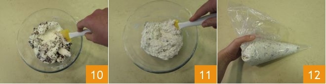 mix with a spatula 10 and, once you have a homogeneous mixture 11, transfer it to a pastry bag 12 and refrigerate.