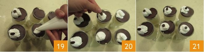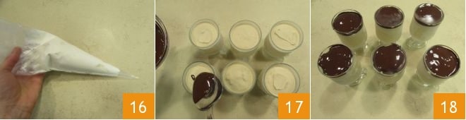 transfer it into a pastry bag and set aside for a moment 16. Melt the dark chocolate in a bain-marie, making sure the water from the pot doesn't come into contact with the chocolate in the pot; once melted, let it cool down and use it to garnish the glasses (17-18).