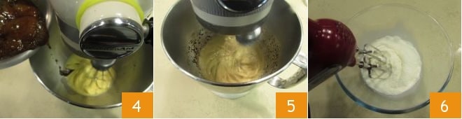 pour the coffee in a thin stream 4 and continue to whip the mixture, increasing the speed of the machine until you have obtained a firm cream and until the mixture has cooled down 5. At this point, whip the fresh cream 6, which should not be stiff but only semi-whipped.