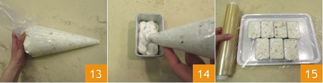 Fill molds of 3.3x2.2 inches with a border of 1.6 inches high 14. Cover with plastic wrap 15 and allow to rest in the freezer for at least 8 hours.