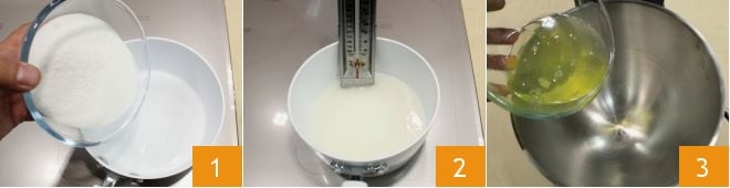 To prepare the colomba semifreddo, start by making the Italian Meringue. Pour the water into a heavy-bottomed saucepan, add the sugar 1, and cook over low heat while stirring. Monitor the temperature of the syrup, which should reach 250°F 2. When the syrup reaches 237°F, pour the egg whites into a stand mixer fitted with a whisk 3 (or use an electric hand mixer) and whip them to stiff peaks at medium speed.