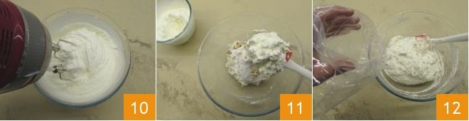 until fluffy 10 and gently fold it into the meringue and colomba mixture with a motion from the bottom up to prevent deflating 11. Transfer the cream mixture into a piping bag without a nozzle (12-13).