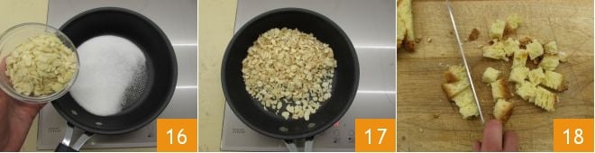 When it's almost time to serve, place the almonds and sugar in a pan 16 and cook over low heat, stirring occasionally, until the sugar is absorbed and adheres to the almonds, forming a light clear coating 17, set aside. Cut 1.8 oz of colomba into cubes 18