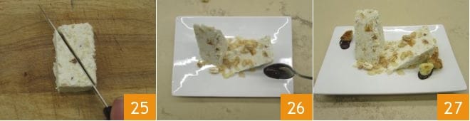 With a sharp knife, divide the semifreddos in half diagonally 25. Arrange them on the serving plate and decorate them with sliced almonds, chocolate 26, and sautéed colomba. Wait until they slightly soften to room temperature and then serve the colomba semifreddo 27.