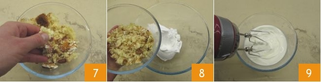 and crumble it with your hands into a bowl 7, add the crumbled colomba to the freshly whipped meringue 8. In a separate bowl, whip the fresh cream with well-cleaned whisks 9