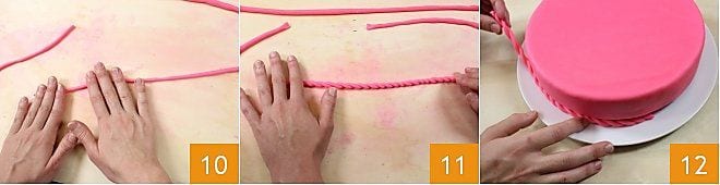 To finish your cake, you can make decorations at the base of the cake. Model the remaining fondant into a sausage shape to create two ropes and twist them together (10-11), for this you just need to roll the ropes onto themselves. Your cake is now perfectly covered with fondant and ready to be further decorated, or to be eaten!