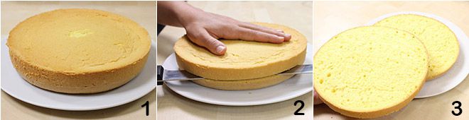 To cut the sponge cake with a knife, get a long, thin-bladed knife like the one usually used for bread, and a table knife. With the help of the smaller knife, make a mark along the entire circumference of the sponge cake, exactly halfway through its thickness, to mark the area where to make the cut 1: this will help you achieve a more precise cut. Now insert the blade of the longer knife following the guideline and try not to tilt the blade 2, then cut the sponge cake completely to obtain two discs of equal size 3.
