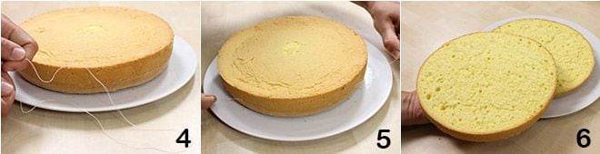 To cut the sponge cake with thread, get a nylon or sewing thread that is strong enough, and a table knife; then proceed to draw the guideline as indicated above 4. Now pass the thread through the mark and, keeping it parallel to the sponge cake, pull until you complete the cut 5. Using this technique, you can make a more precise cut and get a sponge cake perfectly divided into two equal parts 6.
