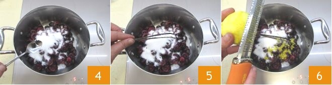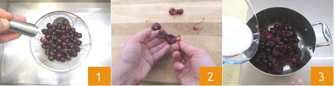 To prepare the cherry and vanilla compote, first wash the cherries thoroughly with cold water 1. Drain them and remove the pits and stems 2, then gather them in a thick-bottomed saucepan, adding the sugar as well 3.