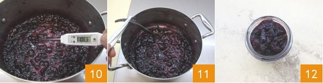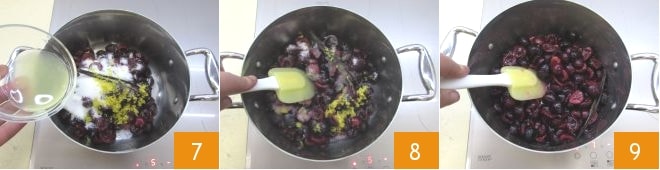 Continue cooking for about 40 minutes, or until the compote reaches a temperature of 226°F 10: at that point, it will be ready. Remove the vanilla bean 11 and transfer the cherry and vanilla compote into a container 12.