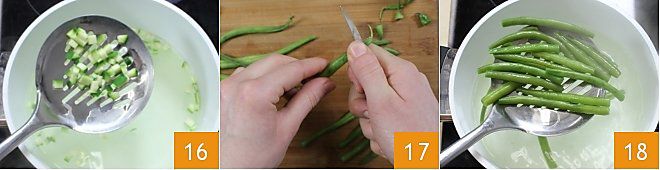 Also, cut the zucchini into small cubes and blanch the obtained cubes 16. Take the green beans, clean them by trimming the ends 17, and blanch them 18.