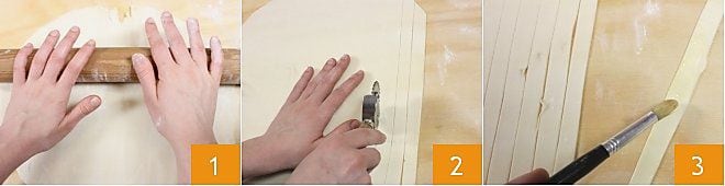 To prepare the spring cones, start by flouring the work surface, then slightly roll out the puff pastry with a rolling pin 1. Once rolled out, cut the puff pastry into strips about half an inch wide 2. Brush the obtained strips with beaten egg 3.