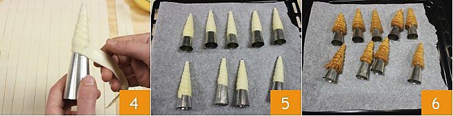 Wrap the puff pastry strip around the special cone for cannoli, starting to wrap the strip from the pointed part of the spindle and proceeding towards the wider part 4. It is important that the side of the pastry that was brushed with the egg does not come into contact with the cone but remains exposed so that the egg acts as a glue between the overlapping puff pastry parts. After completing this work, place the cones on a baking sheet covered with parchment paper and bake in a preheated oven at 356°F (or 320°F if using a convection oven) for 20 minutes (or about 15 minutes if using a convection oven) 5. When the cones are golden, take them out of the oven 6. While your cones cool down, prepare the creams to fill them.
