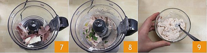 To prepare the cooked ham cream, put the cooked ham, cream cheese 7, and basil 8 in a mixer and blend until you get a thick cream (it is possible to add a splash of cream to make the sauce creamier). Once the cream is obtained, adjust the salt and pepper, blend everything again until you get the right consistency 9. Your cooked ham cream is ready, then move on to preparing the mortadella and pistachio-based cream.
