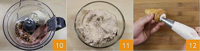 To prepare the mortadella and pistachio cream, put the mortadella, cream cheese, shelled pistachios, and a drizzle of extra virgin olive oil 10 in the mixer. Blend until you get a thick cream (it is possible to add a splash of cream to make the sauce creamier) 11. The creams are ready, put them in two different pastry bags and fill your cones 12 (if you don't have pastry bags, you can take a freezer bag, fill it with cream, cut a corner of the bag to let the cream out, and fill the cones).