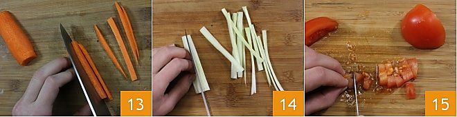 Once the cones are filled, prepare the vegetables to decorate them. Cut the carrots 13 and celery 14 into rather thin strips, while cut the tomato into small cubes 15.