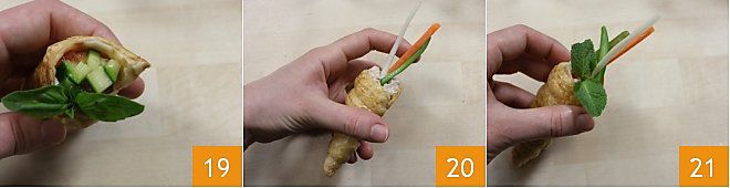 Decorate your cones to your liking with the cubes of tomato and zucchini and finish with a basil leaf 19, or inserting the celery and carrot sticks into the cream 20 and decorating with a mint leaf 21. Your spring cones are ready, keep them in the refrigerator until it's time to serve them.