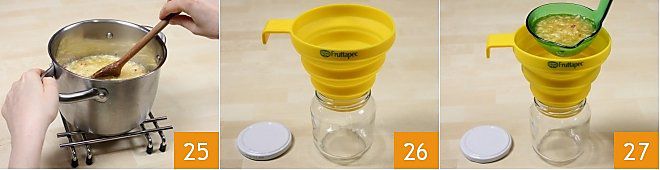Remove the pot from the heat and stir to dissolve any foam 25. Prepare the jars, which you have sanitized, and get a funnel to facilitate pouring the jam 26. Pour the hot jam into the jars using a ladle 27 and
