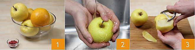 To prepare the apple and orange jam with pink pepper 1, first wash the apples under running water 2. Use a peeler to peel the apples 3,