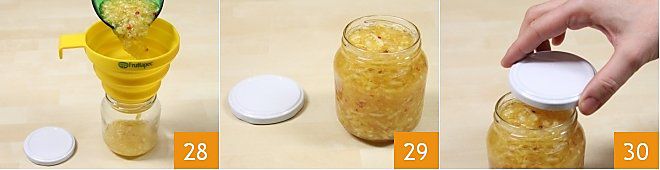 continue 28 to pour until the jars are filled to the brim 29 then, with the appropriate lids, close them 30