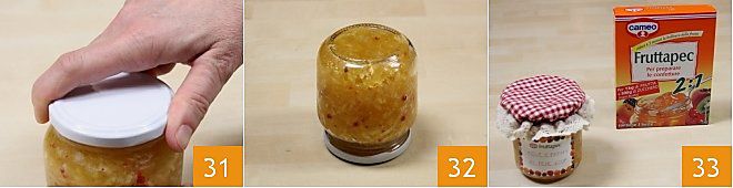 tightening well and ensuring they are hermetically sealed 31. Turn the jars upside down while still hot for 5 minutes; this way, a vacuum will be created, and the lids will also be sterilized 32. Your apple and orange jam with pink pepper is ready: once it has reached room temperature, remember to label the jar to make it recognizable 33.