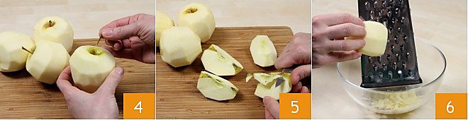 remove the stem 4, cut them into quarters, and also remove the core with a small knife 5. Using a grater with large holes, grate the apples 6,