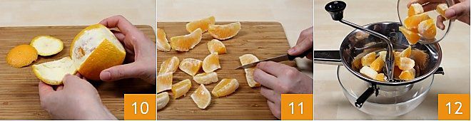 then, slice the peel lengthwise without cutting into the flesh and peel them completely 10. Divide the oranges into segments and cut each segment in half 11. Get a food mill with large holes and set it over a large bowl to collect the juice and pulp of the fruit; pour the orange segments into the food mill 12