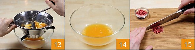 and process them gently 13 to squeeze all the segments 14. Finely chop 1 tablespoon of pink pepper using a sharp knife 15; alternatively, you can use a food processor.