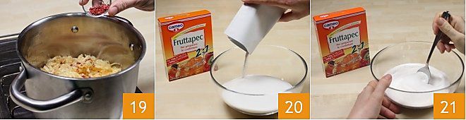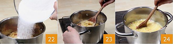 Add the sugar with the Fruttapec cold to the fruit, directly in the pot 22. Bring the mixture to a boil, keeping the flame high and continuing to stir to prevent it from sticking to the bottom 23. When the mixture reaches a boil, let it boil for 3 minutes on high heat, always stirring 24.