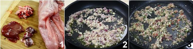 To prepare the rabbit stew, start by removing the excess fat from the rabbit, then extract the kidneys, heart, and liver and set them aside 1. Wash the rabbit, pat it dry with a kitchen towel, and cut it into pieces (or buy it pre-cut). Peel and chop the onion, place it in a pan with the oil 2, and let it wilt over low heat for at least 10 minutes without browning. Add a fine mixture of chili pepper, rosemary, sage, bay leaf, and garlic 3, and sauté for a couple of minutes,