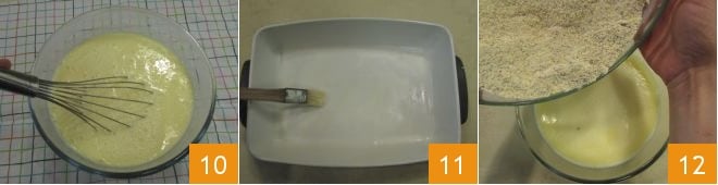 In this way, the egg will come to the same temperature as the butter and milk mix without coagulating 10. Preheat the oven to 340°F in fan mode and butter a 12x9 inch rectangular pan 11; once the liquid mixtures are combined, you can proceed to pour all the dry ingredients into the liquid egg, butter, and milk mixture 12,