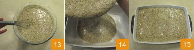 mixing as little as necessary to combine 13. Quickly pour the mixture into the previously buttered pan (14-15) and immediately place in the preheated oven at 340°F in fan mode for about 20-25 minutes, baking on the lowest rack. Adjust for more precision with your oven's power, increasing or decreasing the temperature by 10°F more or less, for example; or leave the 340°F in fan mode unchanged but increase the baking time.
