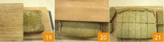 then place another cutting board or a rectangular serving plate on top of the cornbread 19 and flip it again 20. Cut the cornbread into many rectangles to serve it 21.