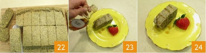 This rich and tasty bread is usually consumed in small pieces 22, perhaps seasoned in the sweet version with fresh fruit and maple syrup 23; for example, we chose strawberries. Your cornbread is ready to be served as a dessert 24, or simply to enrich the bread basket!